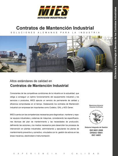 Conscientes de las competitivas condiciones de la industria en la actualidad, que obligan a conseguir un óptimo funcionamiento del equipamiento industrial y los servicios o productos, MIES ejecuta un servicio integral de mantención de Plantas Industriales, de calidad y eficiencia comprobadas en el tiempo, donde destacan contratos con importantes empresas nacionales.